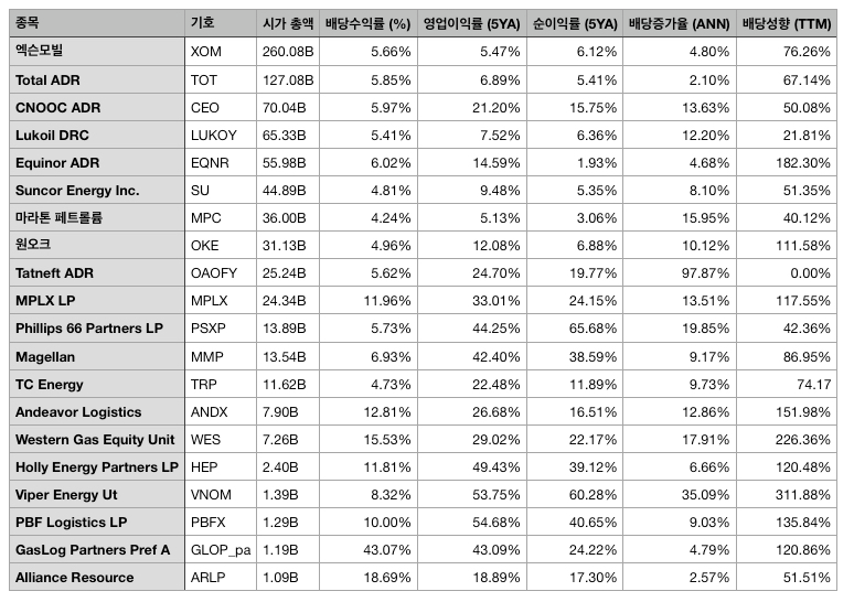 2040년의 주요 에너지원은 석유와 가스로 전체 에너지 수요 비중의 약 60%를 차지한다. 이런 이유로 기타 대체에너지에 대한 투자는 아직은 시기상조라 생각한다. 이런 관점에서 미국의 에너지자원과 관련된 기업을 시가총액순으로 리스팅해 보았다. 가장 먼저 눈에 들어온 것은 엑슨모빌(XOM)이었다. 500개가 넘는 에너지 관련 미국 주식 중에서 크게 4가지 기준(시가총액 1조 이상, 배당수익율 4%이상, 영업이익율 5%이상, 배당증가율 2%이상)으로 검색해 보니 남은 것은 20개 뿐이었다. 그 20개 중에서 시가총액, 배당수익율, 5년간 영업이익율, 5년간 순이익율, 배당증가율, 배당성향을 고려했을 때 XOM, TOT, CEO, LUKOY 등이 매력적으로 보였으나 최종적으로는 XOM으로 결정하였다. 아무래도 대장주가 주는 안정성가, 셰일가스 추출에 대한 투자가 다른 기업 대비 넘사벽 수준이었기 때문이다.