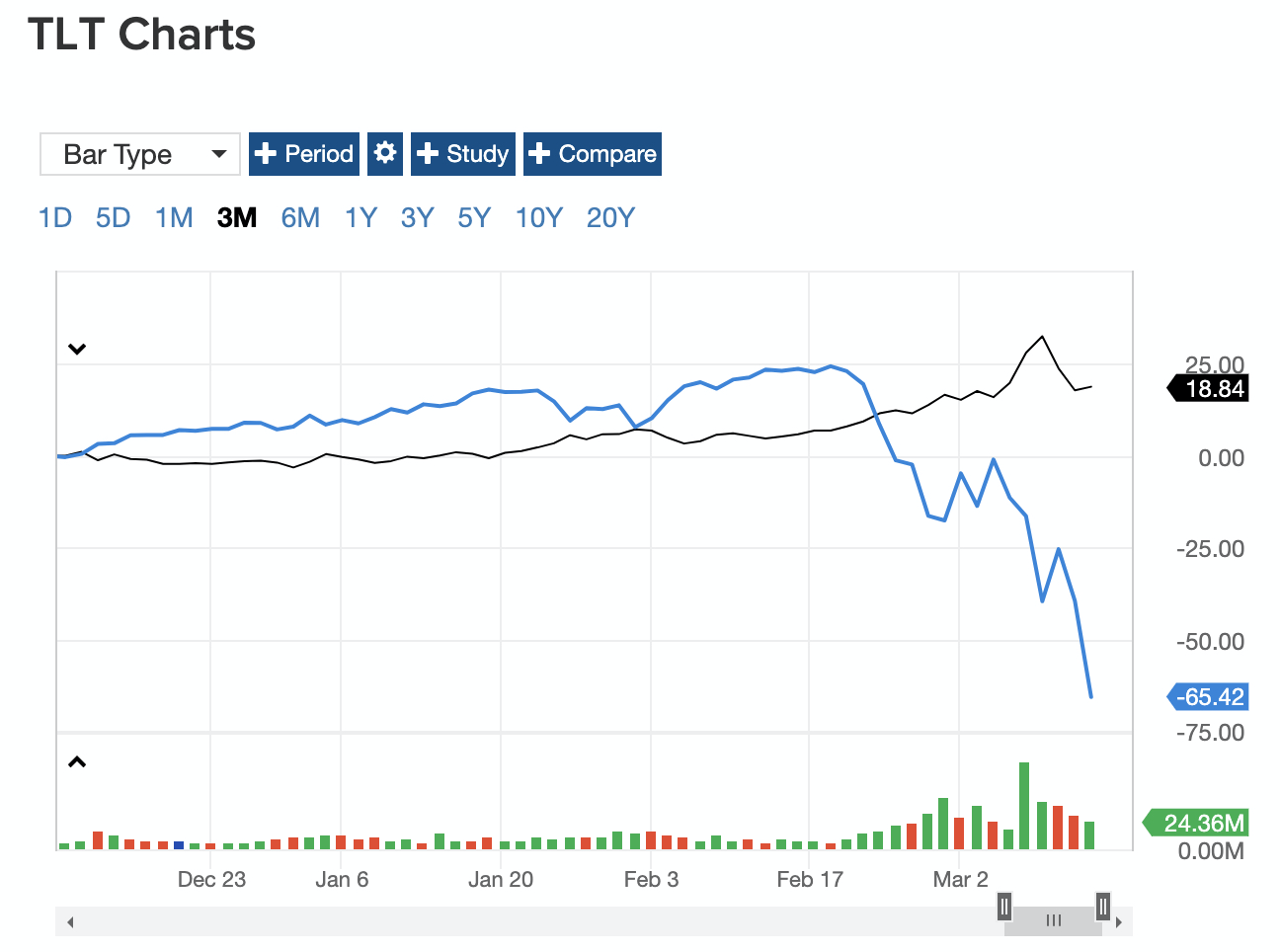 3월 9일 TLT ETF 가격은 엄청나게 올랐다. 왜냐면 미국 주식 가격이 폭락했기 때문이다. 이유에 대해서는 아래 자세히 다루도록 하겠다. 먼저 채권을 왜 투자해야하는지를 언급하고 싶었다. 아래 S&P500 미국 주가와 TLT ETF를 비교한 차트를보면 더 극명하게 드러난다. 주가가 떨어지면, 그만큼 오른 채권을 팔아 현금화 해둔다. 현금화한 돈으로 폭락한 주식을 줍는다. (파란색 선이 S&P500 이다)