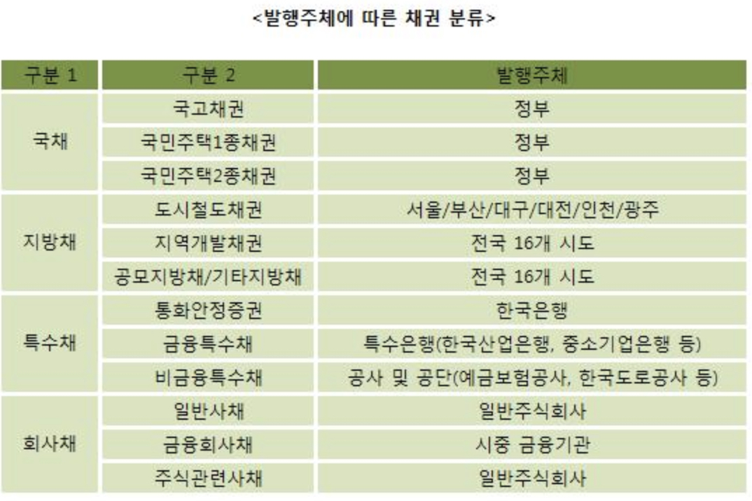 채권은 발행처에 따라 국채, 지방채, 특수채, 회사채로 나뉜다. 나라가 돈이 필요하냐, 누가 필요하느냐에 따라 이름을 나눴을 뿐이다. 채권투자의 참여자 중 채무자는 대부분 기관단위다.
