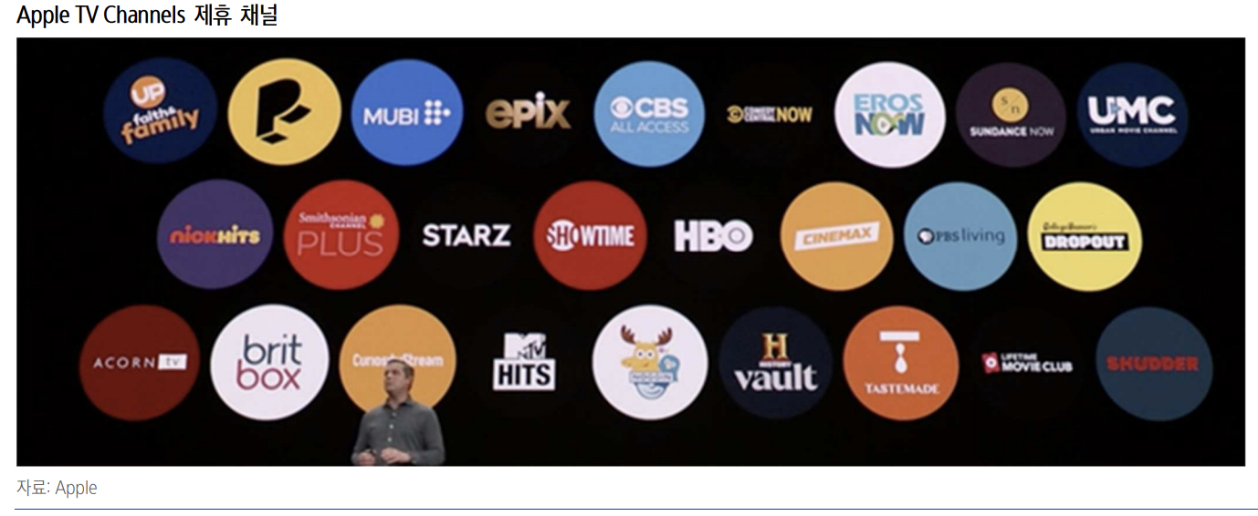 애플 서비스 중 하나인 애플티비의 제휴 채널은 아래와 같다. 애플 티비를 이용하면 아래 제휴사들의 콘텐츠를 별도 가입이나 구매 없이 이용할 수 있다 한다. 이전에는 오직 애플 제품으로만 해당 앱을 이용할 수 있었는데 향후에는 타사 기기로도 해당 앱에 접근할 수 있도록 할 방침이라 한다.