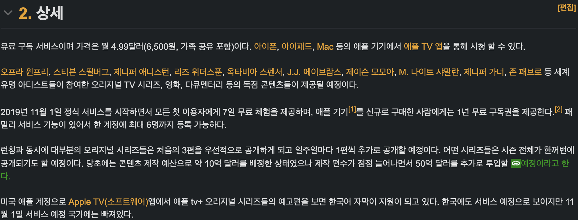 애플 티비 채널이 앱이라면 애플 티비 플러스는 애플이 독점적으로 제작하고 배포하는 콘텐츠 사업이다. 넷플릭스의 유료 구독 서비스와 비슷하다고 할 수 있다. 넷플릭스가 자체 플랫폼의 경쟁력 강화를 위해 넷플릭스 오리지널 콘텐츠를 제작하듯, 애플도 애플 티비 채널의 경쟁력을 강화하기 위해 애플 티비 플러스를 기획하고 있는것이라 볼 수 있다. 애플 티비 플러스에 대한 설명은 나무위키에 잘 설명되어 있어 아래 첨부한다.