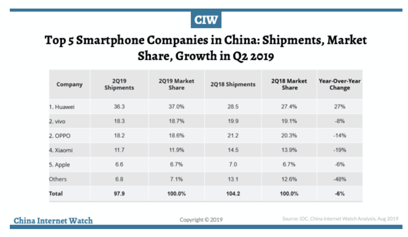 2019년 2분기 전년대비 스마트폰 출하량을 보면 화웨이는 27% 성장하여 시장 점유율이 37% 달하는데 반해 애플은 6% 감소하여 시장 점유율이 약 7%에 불과하다. 아쉽지만 삼성은 그보다 더 밑이긴 하다.