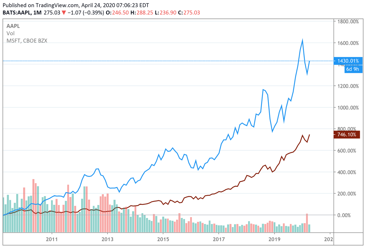 마이크로소프트와 애플 주식의 5년 수익율 비교는 어떨까? 예상 외로 마이크로소프트가 아득히 애플의 수익율을 넘어선다. 그러나 10년 수익율을 비교해보면 애플 주식의 어마어마한 수익율을 볼 수 있다. 수익율이 1400%라니 정신 나간 그래프긴 하다.