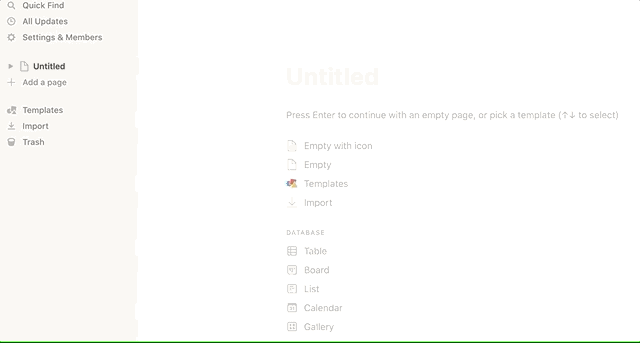 다 지우신 후 "+ Add a page"를 누르시면 [Untitled]라는 세로운 템플릿이 아래 처럼 생깁니다. 제목을 지어주고, 아이콘도 원하는걸 선택하시면 됩니다.