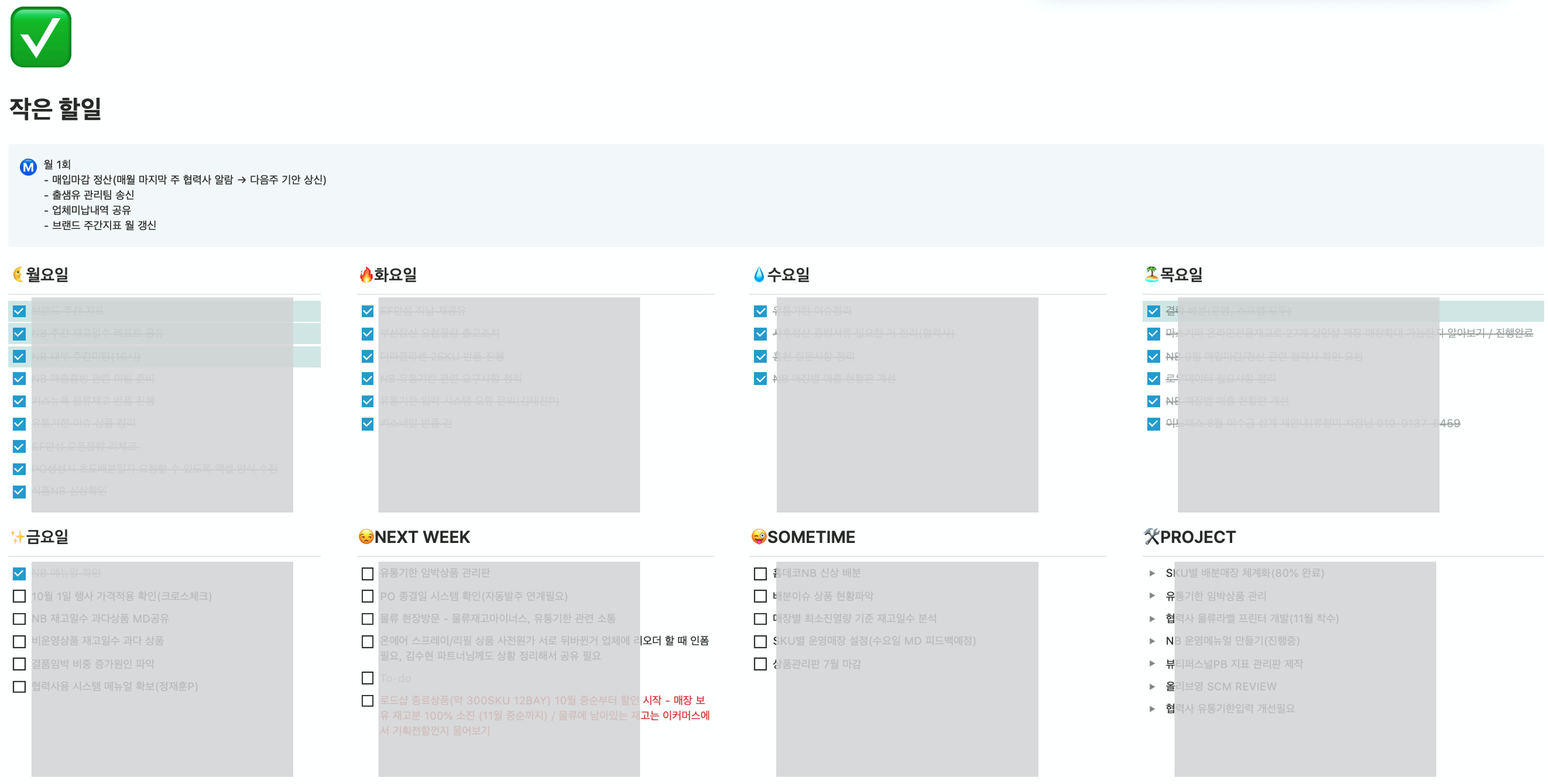 - 넷째, 계속 롤링하는 성격의 프로젝트들을 잊지 않기 위해 "PROJECT" 섹션을 만들어두었습니다. 이건 CHECKLIST형태가 아닙니다.