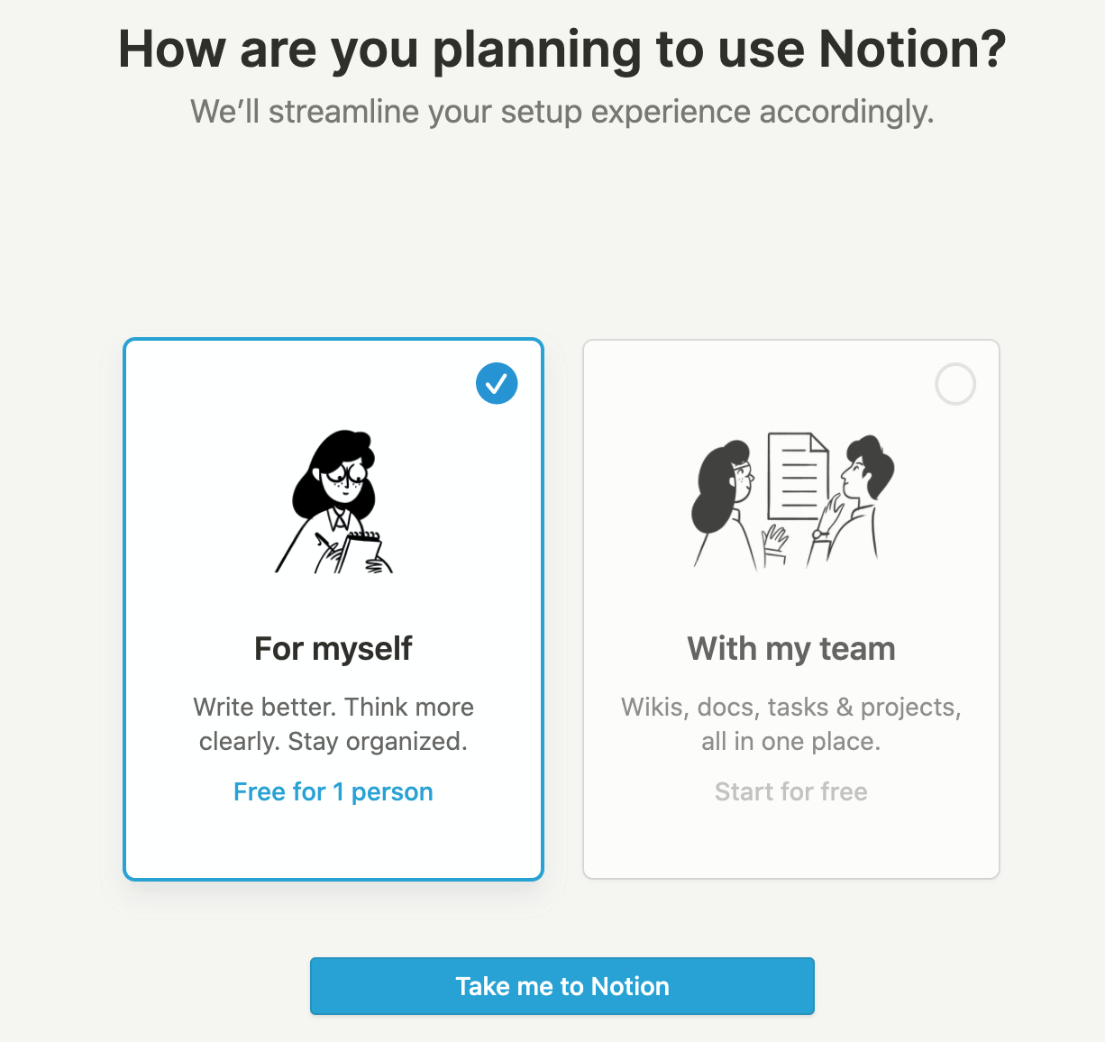 첫 로그인을 하면 개인용인지 팀용인지 물어보는 창이 뜹니다. 우선은 개인용으로 클릭하시면 됩니다. 클릭하신 후 "Take me to Notion"을 클릭하시면 됩니다.