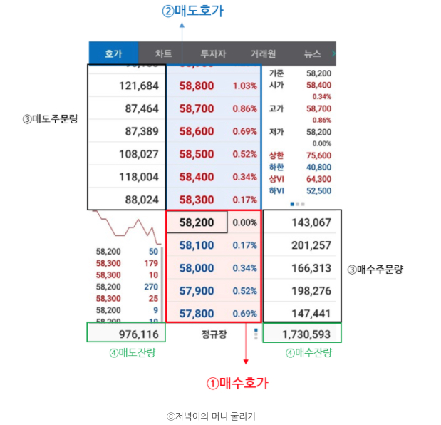 #호가 - 증권 시장에서 주식을 보유하는 사람이 매도하려는 가격, 주식을 사려는 사람이 매수하려는 가격을 말합니다.
