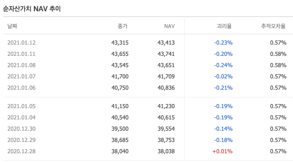 어떤 사이트에서는 iNAV를 그냥 NAV라고 표현한다고 합니다. 이럴 때는 한 30초 동안 숫자가 바뀌나 바뀌지 않나 바라보고 있으면 NAV인지 iNAV인지 확인할 수 있습니다. 괴리율도 마찬가지 입니다.