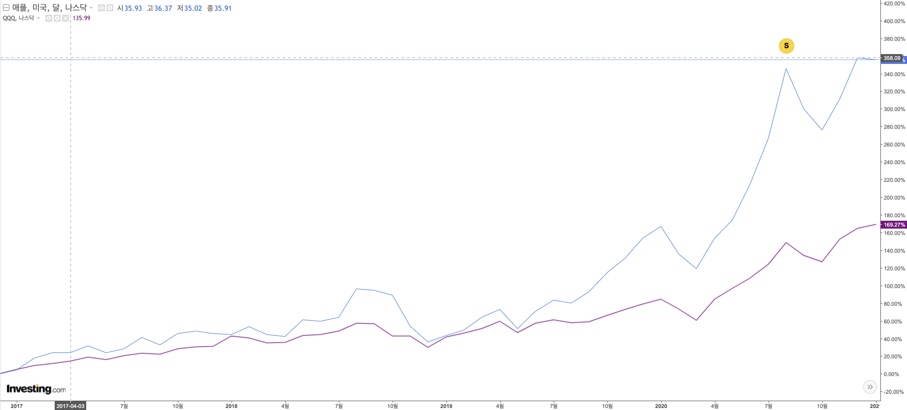 ETF의 장점은 개별주식의 편리성(증권계좌로 장중 매도/매수 즉시가능, 환금성 용이), 소액 분산투자로 리스크관리 가능, 펀드대비 확연히 낮은 운용보수의 장점이 있습니다. ETF라고 무조건 좋은 것은 아닙니다. ETF는 여러개의 주식을 담고 있기 때문에 ETF에서 가장 수익이 좋은 주식 하나만 100% 개별 투자했을 때보다 수익율이 낮을 수 있습니다. 나스닥100 ETF의 수익율이 애플의 하나에만 투자했을 때보다 낮은 것이 그 예입니다. 그러나 사실 둘 모두 어마어마한 수익율을 기록하긴 했습니다.