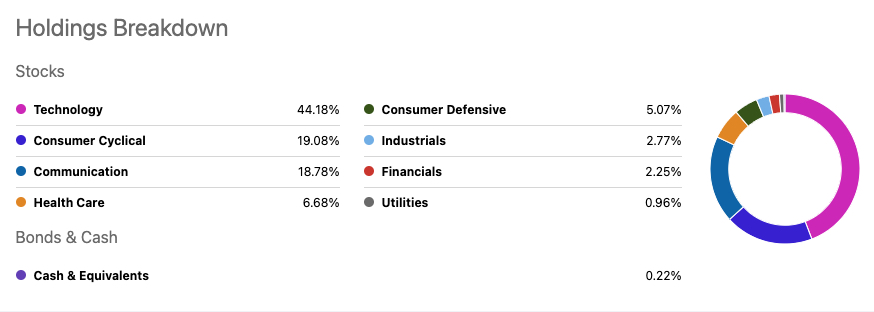QQQ ETF에서 가장 많이 보유하고 있는 주식은 역시 애플입니다. 시가 총액이 제일 높으니 당연한 결과지요. 분야별로 보면 나스닥이다 보니 당연히 기술주들이 많이 담겨 있습니다. 경기순환주, 소비주도 담겨 있는 것을 보니 신기하네요. 그래도 생각보다 기술 분야의 비중이 44%로 엄청 높지는 않은 것 같습니다.