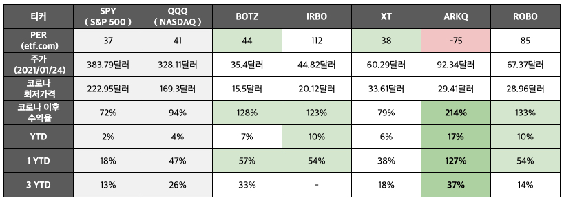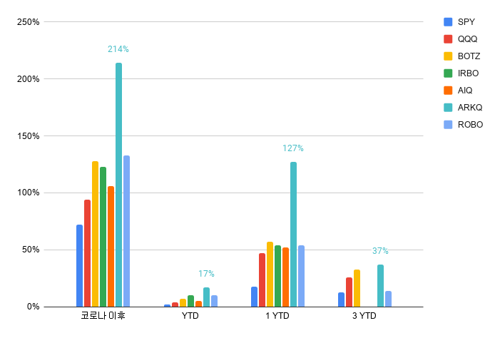 그러나 아이러니하게도 코로나 최저점 이후 현재 가장 높은 수익율, 금년수익율, 1년간 수익율, 3년간 수익율 모두 ARKQ가 압도적으로 우위인 것을 볼 수 있습니다.