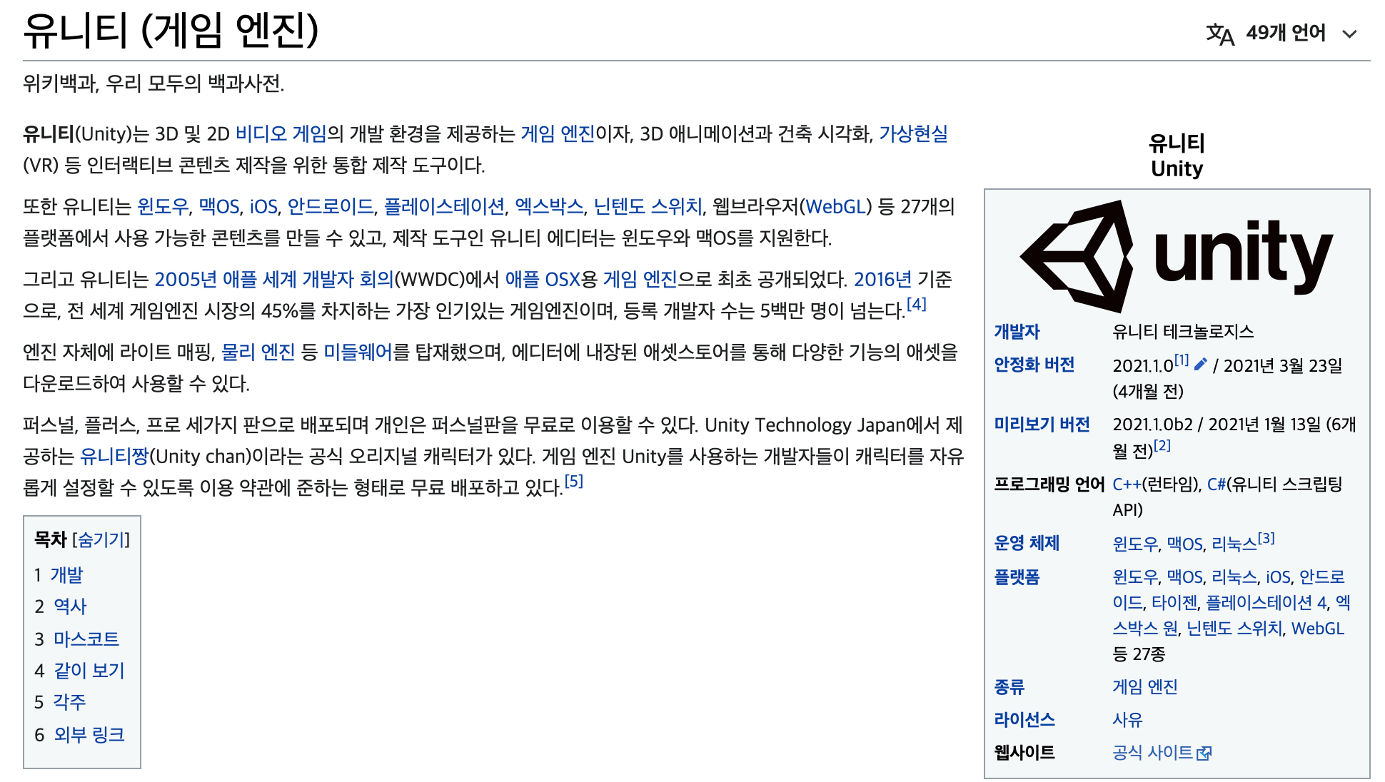 윈도우, 맥, 리눅스, 안드로이드, 플스, 엑스박스, 닌텐도 플랫폼에서 구현하는 게임을 만들 때 모두 유닉스 게임 엔진을 통해 만들 수 있습니다. 전 세계 게임 엔진 시장의 절반 가까이를 차지하고 있으며 등록된 게임 개발자 수가 5백만명이 넘습니다. 유니티 게임엔진으로 개발한 대표적인 게임드롤는 포켓몬고, 어몽어스, 하스스톤, 폴가이즈 등입니다.