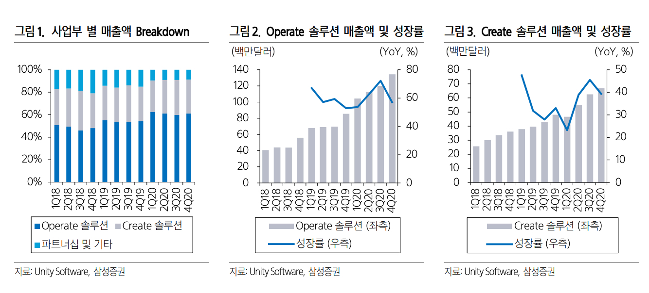 삼성증권 리포트에 따르면 글로벌 TOP 1,000 모바일게임의 약 70%게 유니티를 이용해 만들어졌다고 합니다. 앞서 게임 산업 중 그 중에서도 모바일게임의 성장율이 연평균 15%에 달한다는 점을 보았을 때 유니티는 유망한 기업이라 볼 수 있습니다.